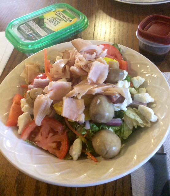 I like to start with lettuce – a combination of iceberg and romaine. Iceberg also gets a bad rap for being mostly water. But I like the crunchiness of it. I add shredded carrots, tomatoes, red onion, summer squash, zucchini, any color bell pepper, broccoli, edamame, radishes, beets…. The possibilities are endless. My husband likes mushrooms and alfalfa sprouts. I found marinated mushrooms that are mostly vinegar with no oil – they are delicious! I also add some pepperoncini rings and a little fat free feta cheese.