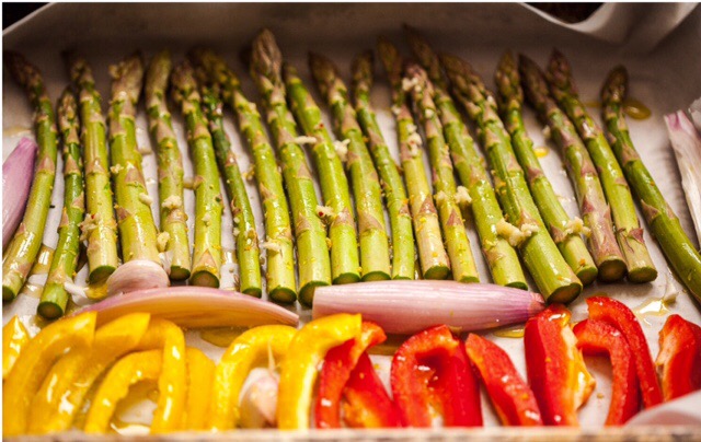 Prepare veggies – peel squash, remove seeds from peppers, trim ends of asparagus, cut into smaller pieces of desired.