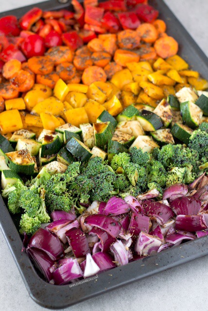 Spread veggies in a single layer. (I try to place them according to cook time. For example, asparagus roasts pretty quickly and doesn’t need to be turned, while butternut squash takes longer and needs to be turned for uniform roasting.