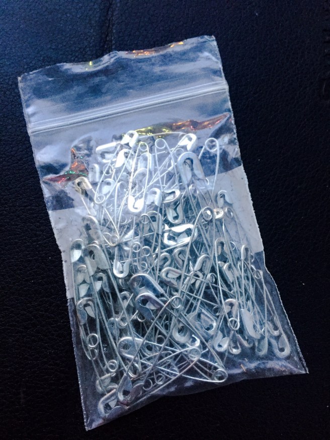 Well, Connie arrived, with safety pins. Kathie brought safety pins. Janet arrived with – you guessed it – safety pins. Donna? Safety pins. We had enough safety pins to accommodate Heaven’s army of angels. A few of the elastic straps broke and we did use a few of the pins. Like always, we were over-prepared.