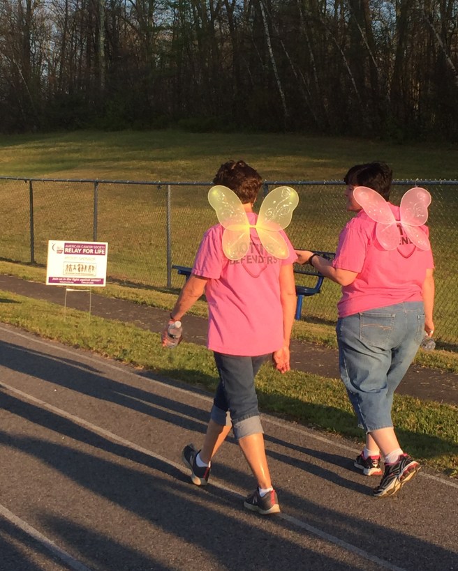 On a recent Friday night, my friend Dotti was participating in a local Relay for Life event. She is a two-time Cancer survivor. She was part of a team called Carol’s Angel’s, in honor of another dear friend who lost her battle 10 years ago. We decided to surprise Dotti by showing up to walk a few laps with her. Of course, we never do anything without a theme – and costumes. We had coordinating tee-shirts and wings. Yes, I said wings.
